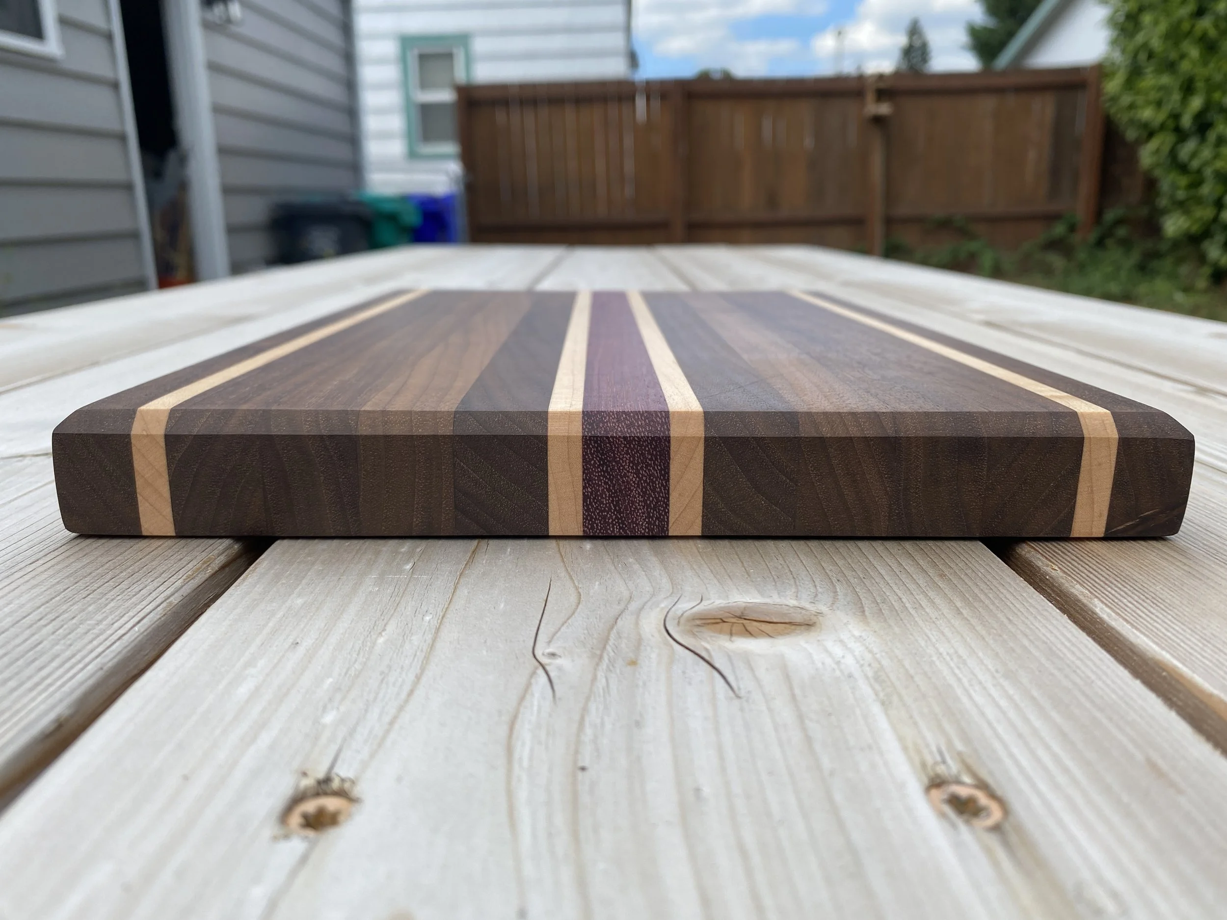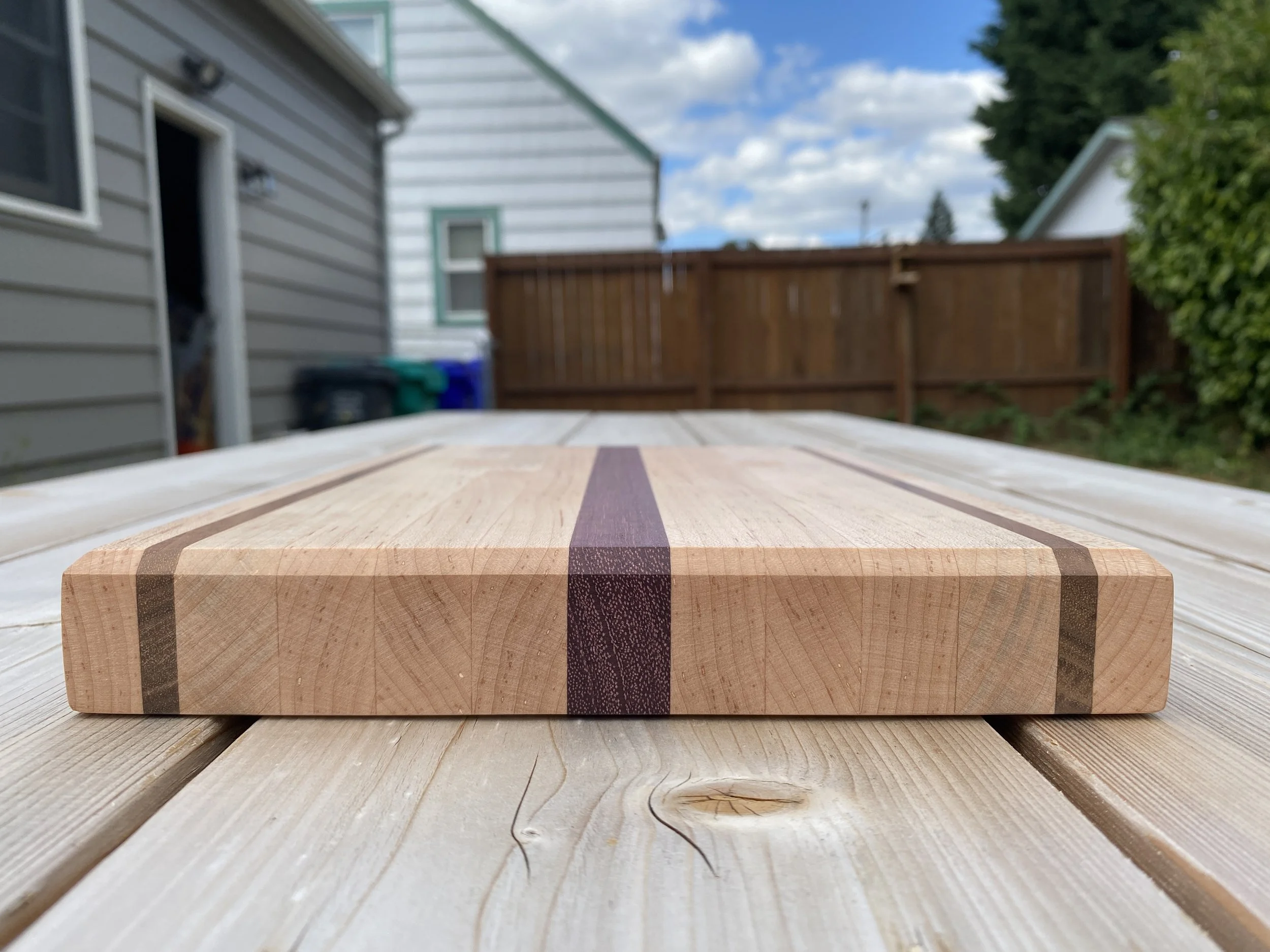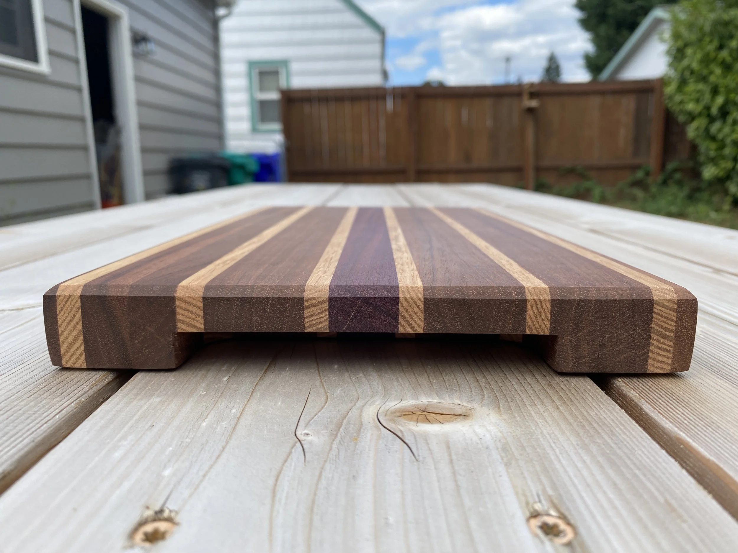 This large, handcrafted, edge-grain cutting board combines walnut with padauk and maple stripes.
